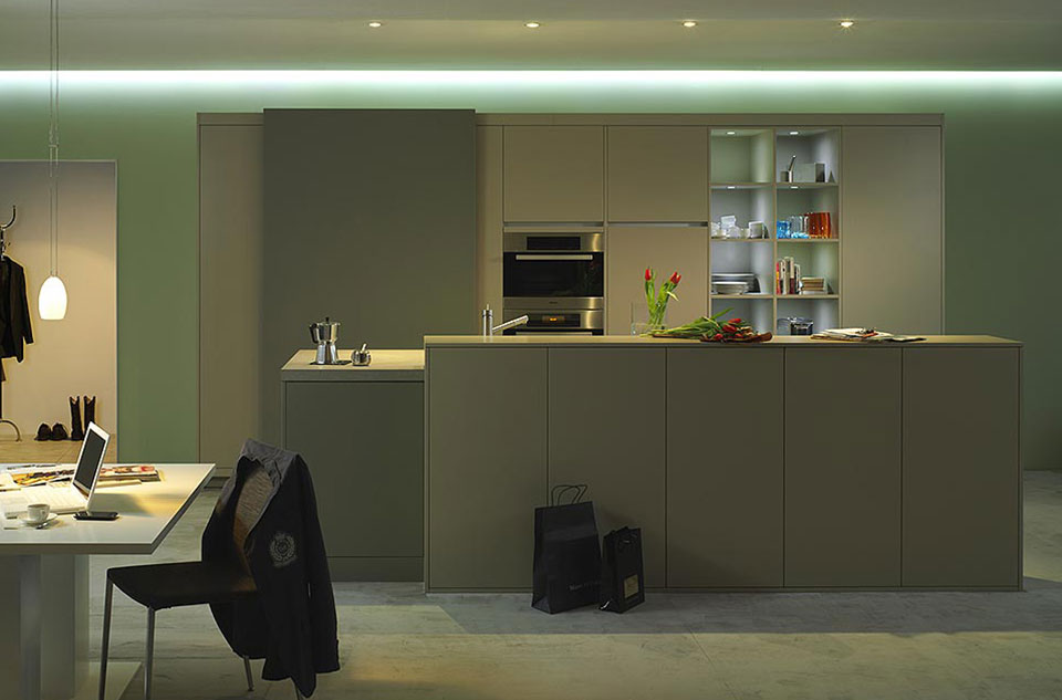 Basiert auf dem Grundmass 60cm Möbelbreite. Unterbauten und Hochschränke sind bündig.